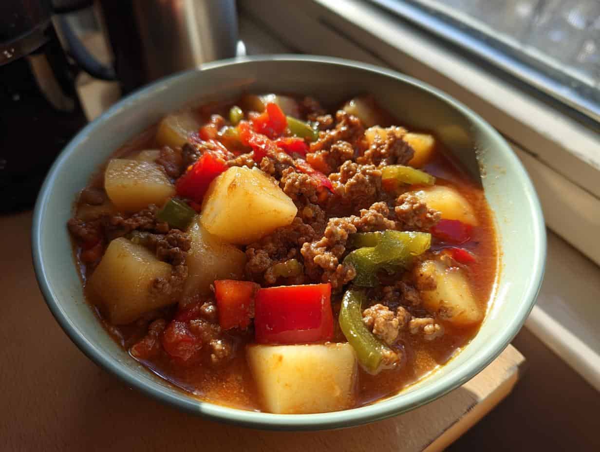 Schneller und einfacher Bauerntopf mit Hackfleisch, Kartoffeln und Paprika. Ein ideales Familiengericht.